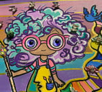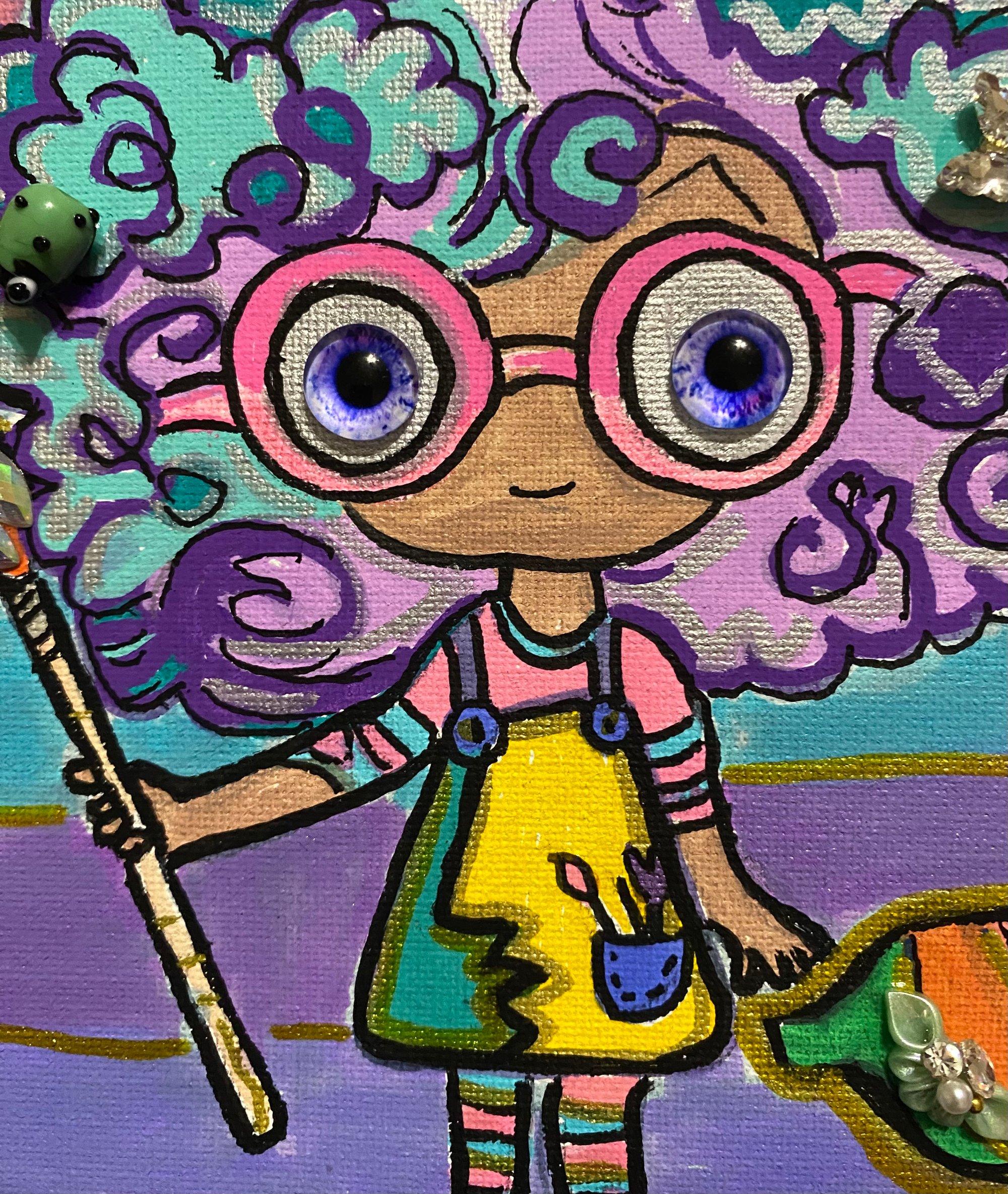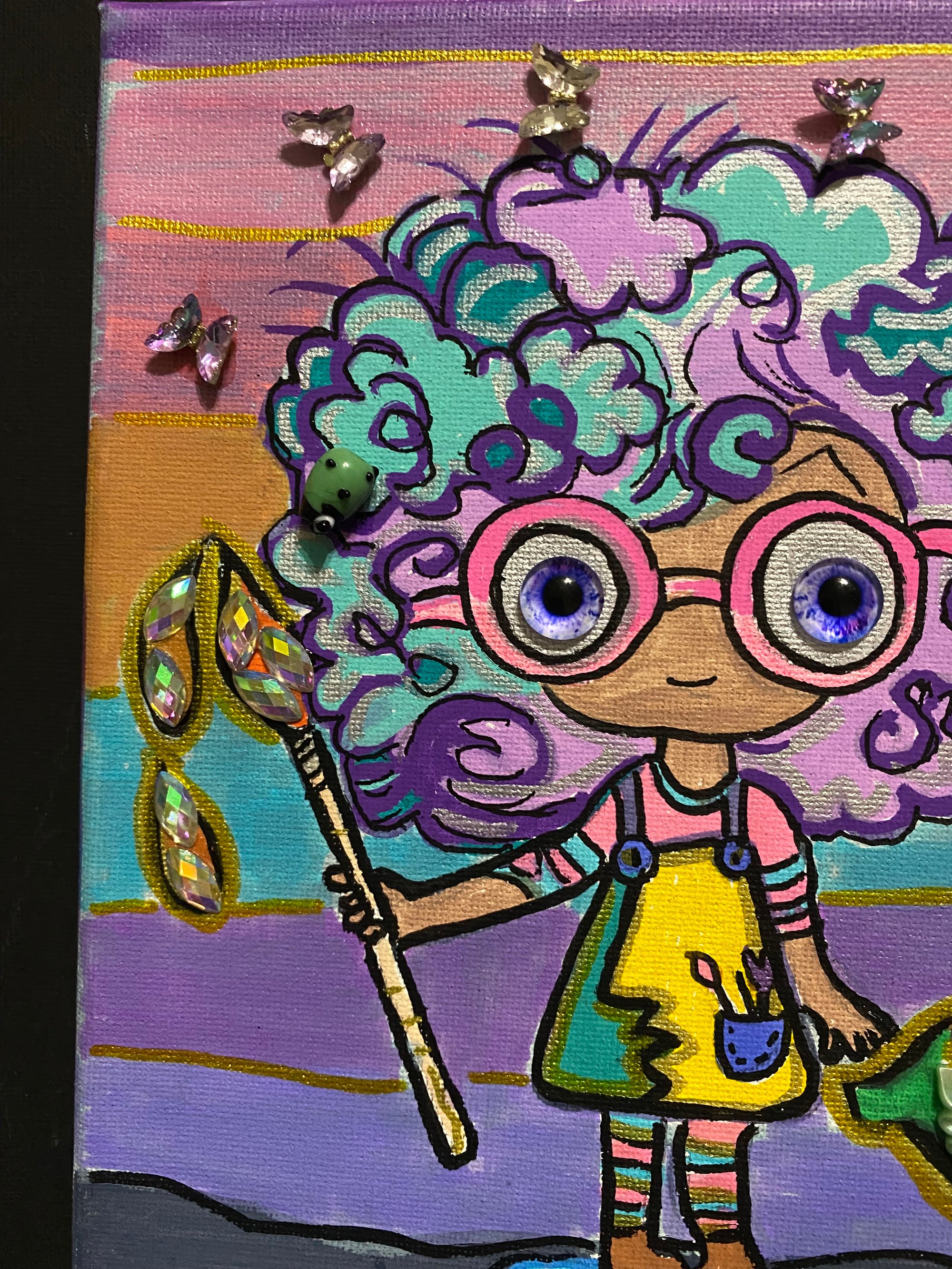 This 12 by 12-inch canvas has been painted with acrylic paints. This girl represents all women and girls who love creating with their hands. This painting is done in pastels but also brightness. The girl is an artist, shown with her paintbrush. To her side is a blue bird with a colored rainbow flowing from her beak. This painting is decorated with glass rhinestones, utter flies and more.