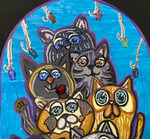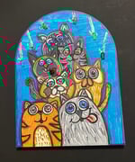 This 9 by 12-inch tombstone shaped canvas was perfect for this mixed media painting of a clowder of cats. I created this painting with acrylic paints, acrylic molding paste and glass ladybugs/fish. Each cat has their own personality. One of the cats has a glass ladybugs bug on his face. A round the top are fish hooks painted on with molding paste for a 3-D effect. On each hook is a glass fish.