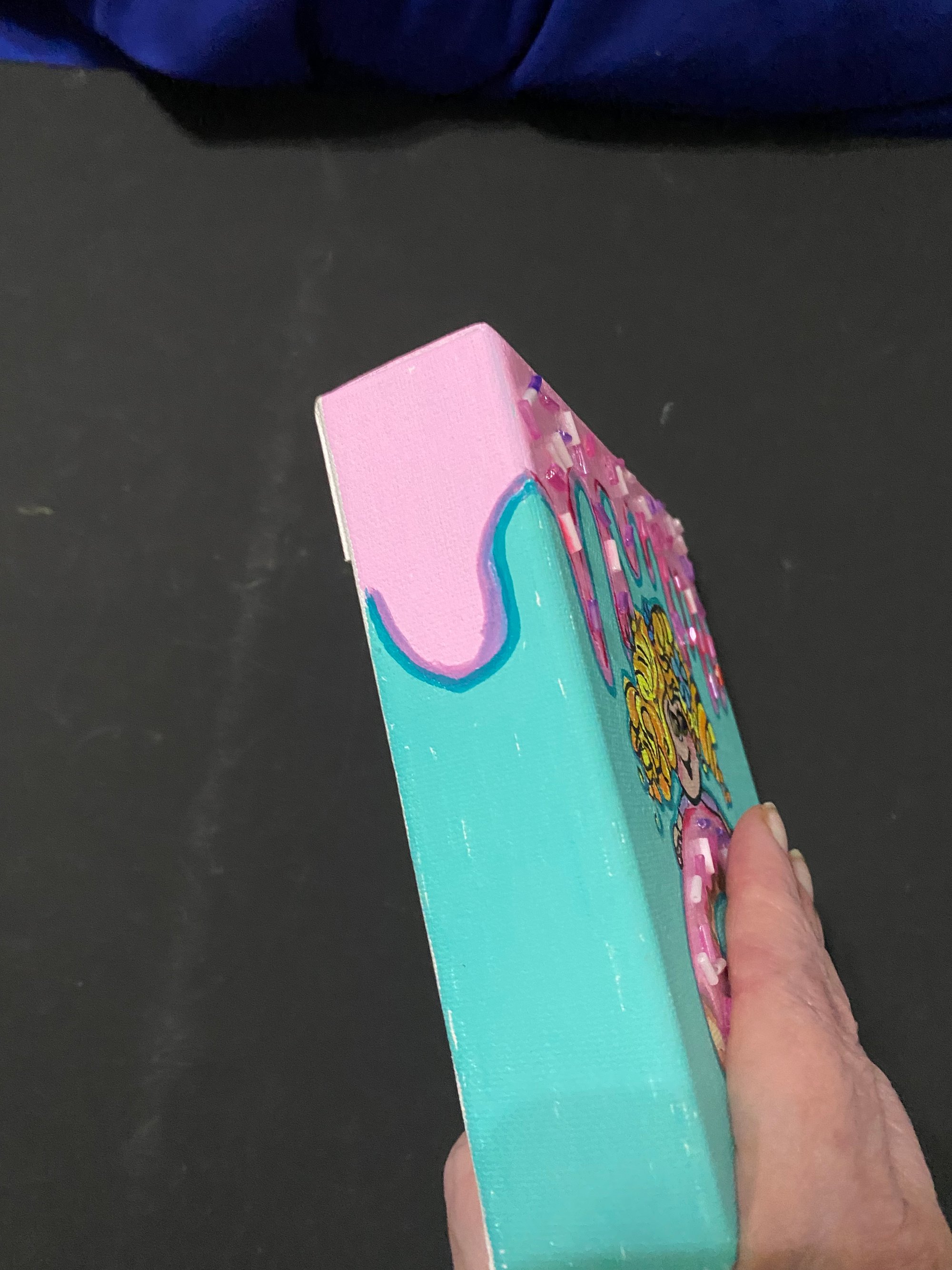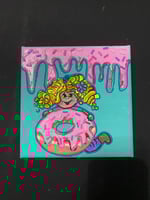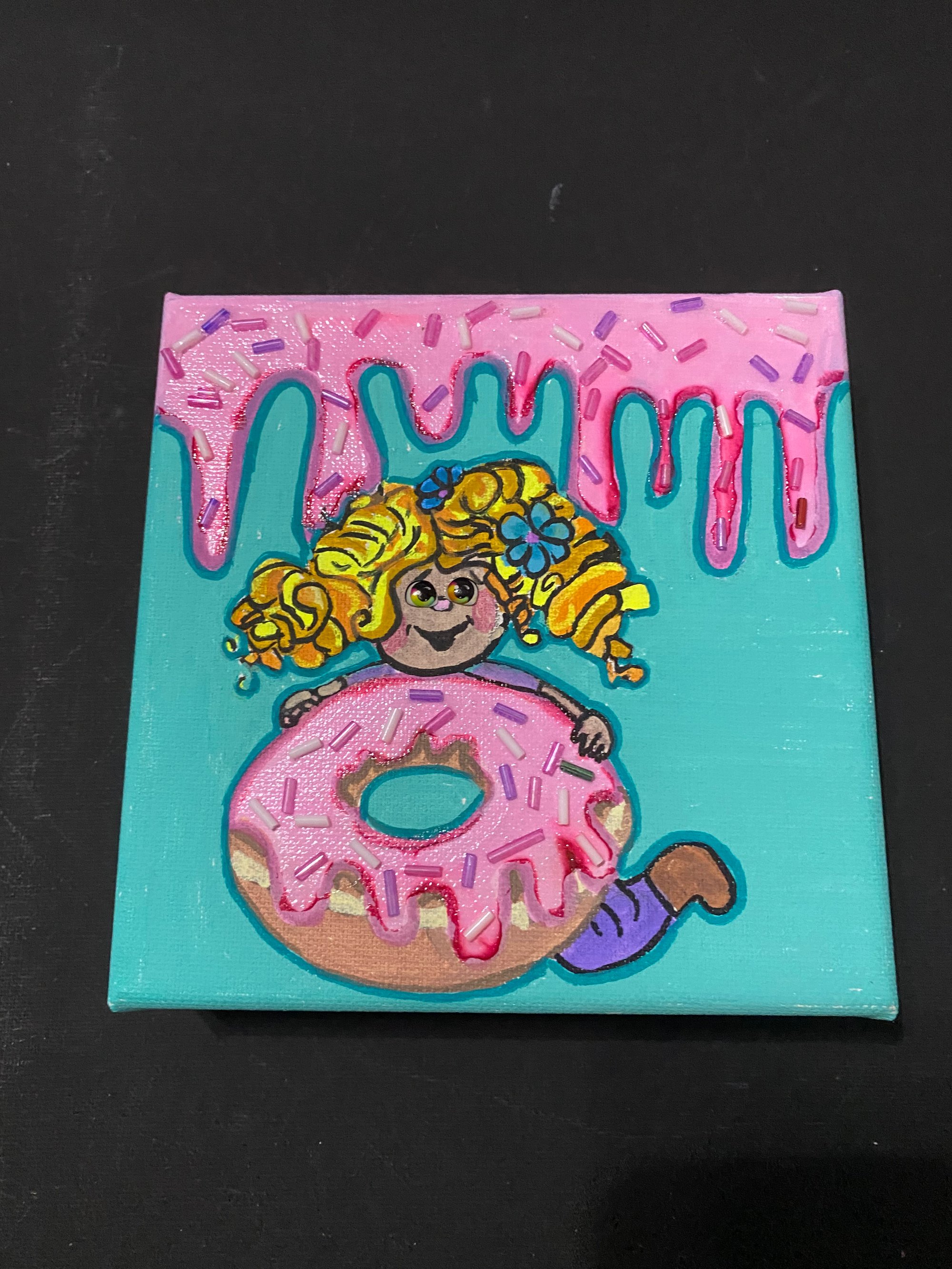 This 6 inch square canvas was painted with acrylic paints and accented with glass bugle beads. This painting has a blonde headed child holding onto a giant strawberry topped doughnut. The top of the canvas had strawberry icing dip dripping down. On both the icing on the top and the doughnut we have used glass bugle beads for accent. This painting is freestanding or you can hang it on the wall.