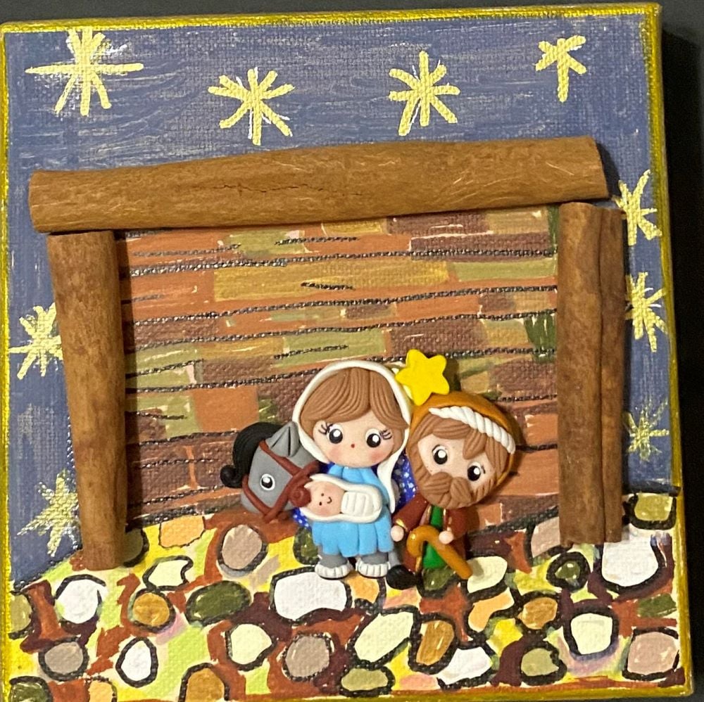 This handcrafted nativity is crafted on 6 by 6 by 1 1/2 canvas. The background is hand painted using acrylic paints. The "stable" arches are created using real cinnamon sticks. Mary, Joseph, baby Jesus are riding on a donkey all created from polymer clay.
