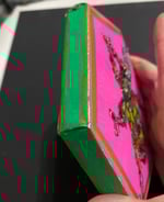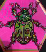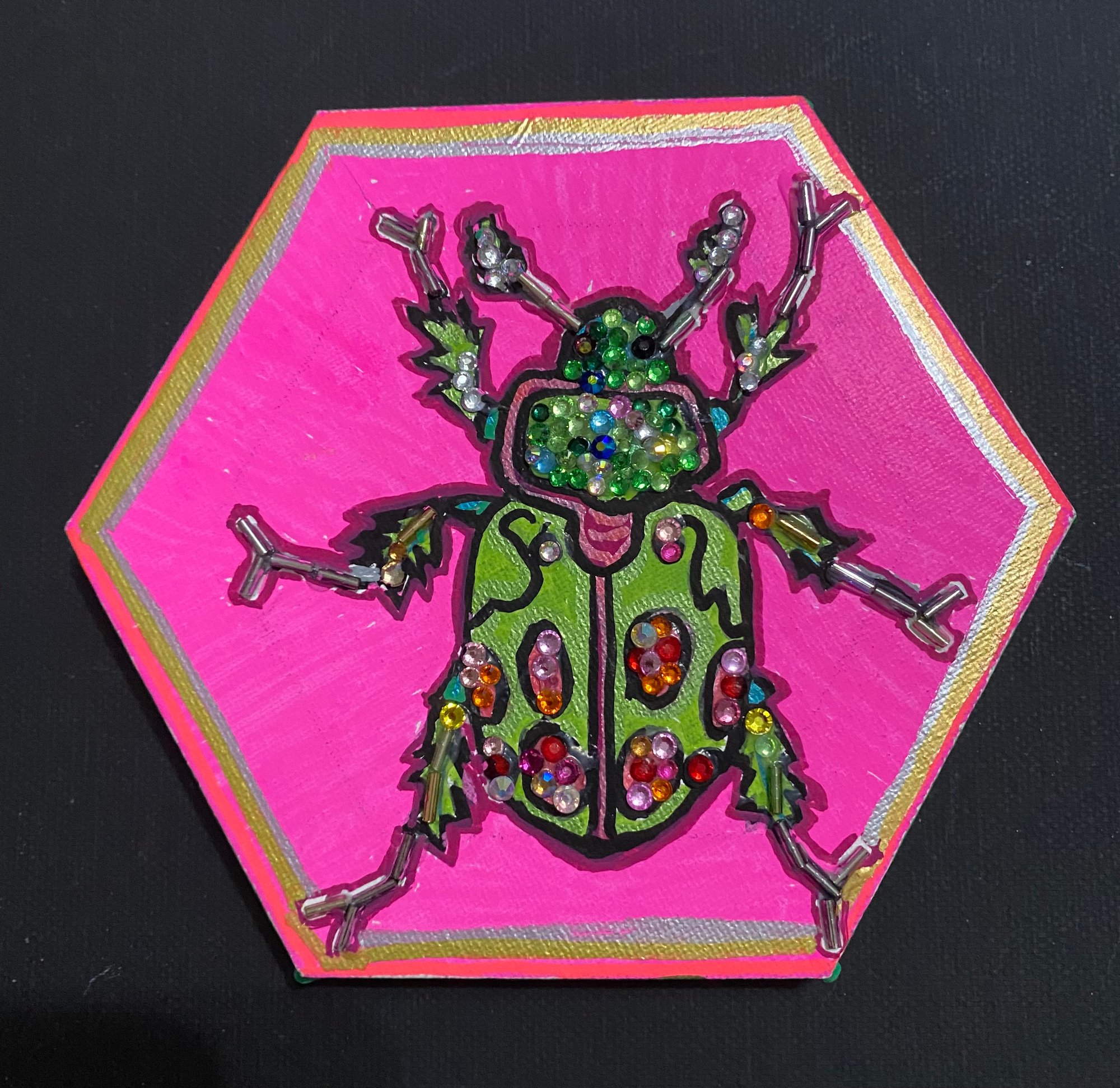 This 5 by 6 inch octagon shaped canvas was painted using acrylic paints. The surface colors are hot, pink, green, silver, and gold. The beetle was not created color wise by any actual insect. These are colors that I like in a bright. In a pop art style. The Beatles itself based colored or green tones with a magenta, accent, silver and gold on the legs. Glass rhinestones and bugle beads make up the jeweled look.
