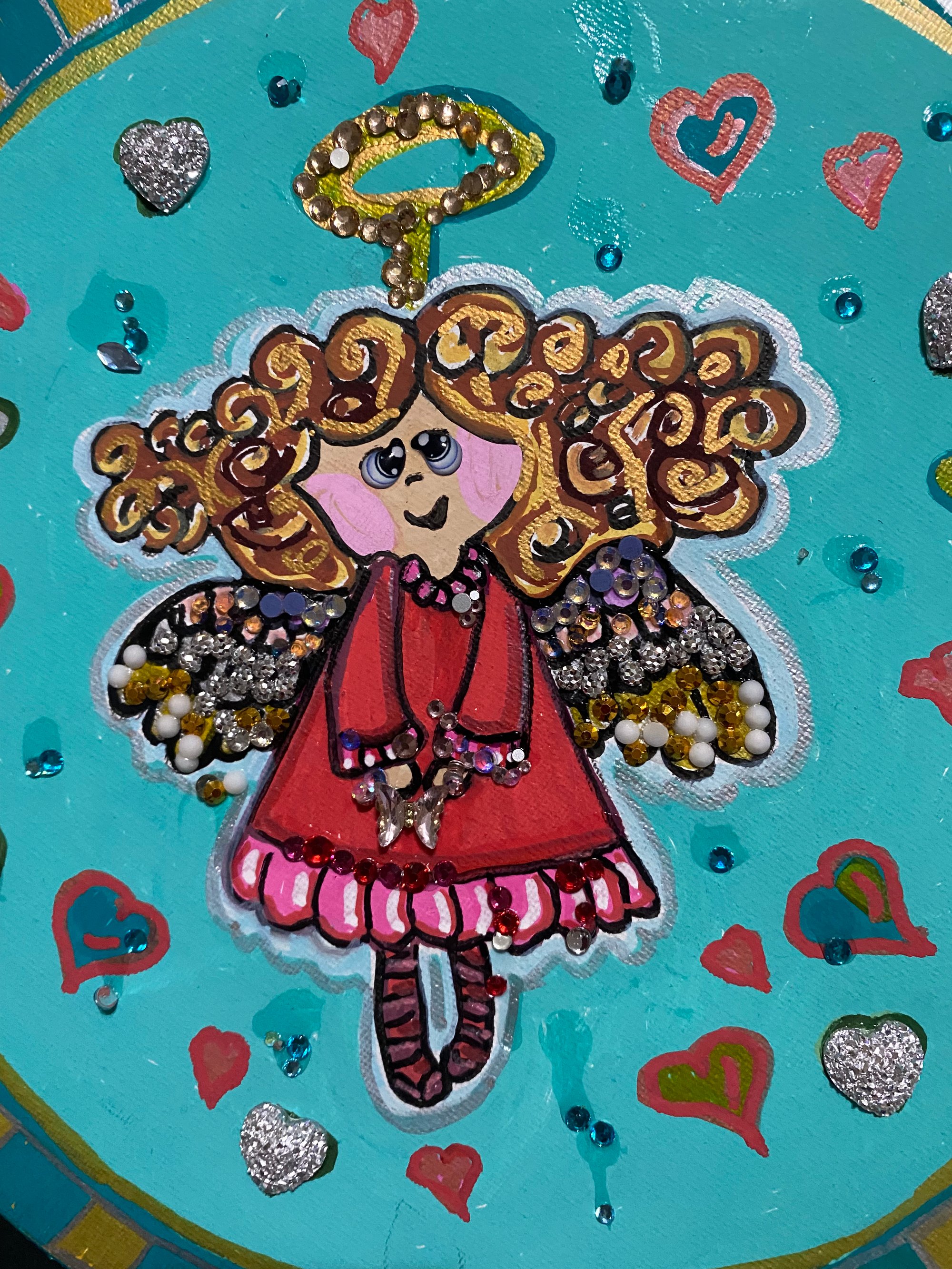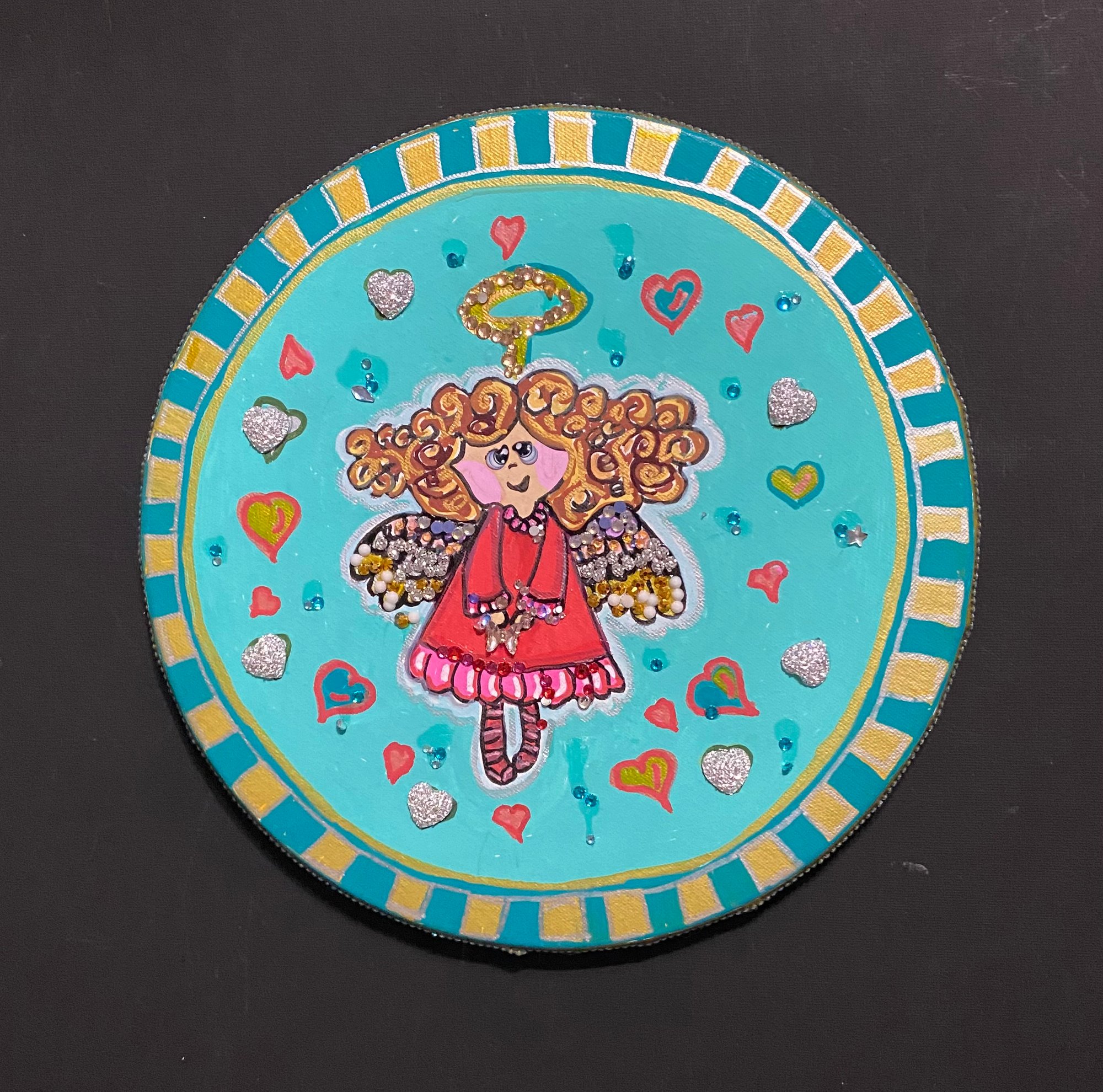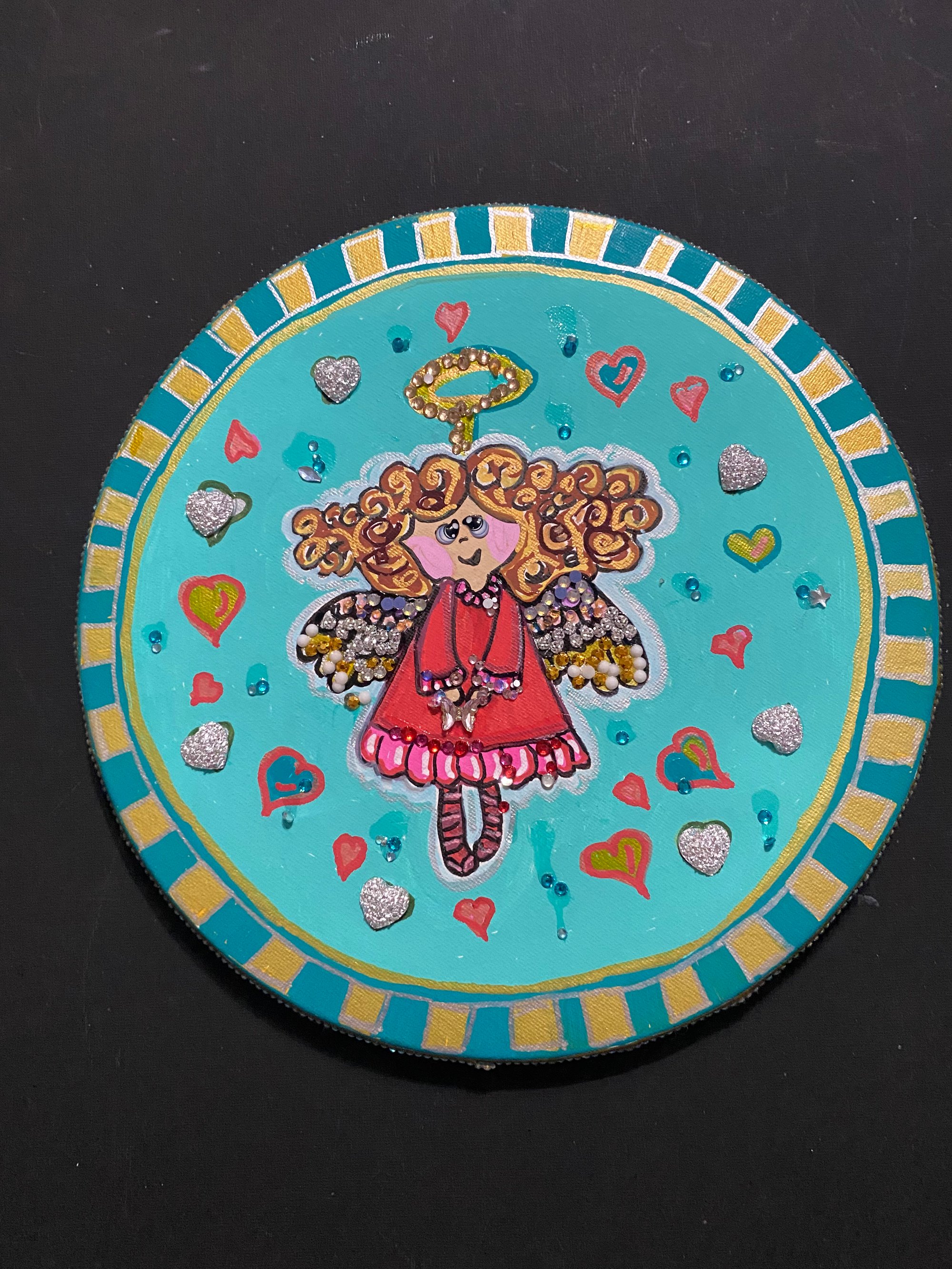 This 10” round canvas features a blond angel. This was painted with bold acrylic paints. I decorated the face of the canvas with rhinestones and glass butterflies. Around the outside of the canvas I applied rhinestone ribbon.