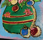 This painting uses glass bugle beads, glass rhinestones and glass beads to detail and accent certain objects. The ornament painting has been sealed with triple thick for high glass shine.