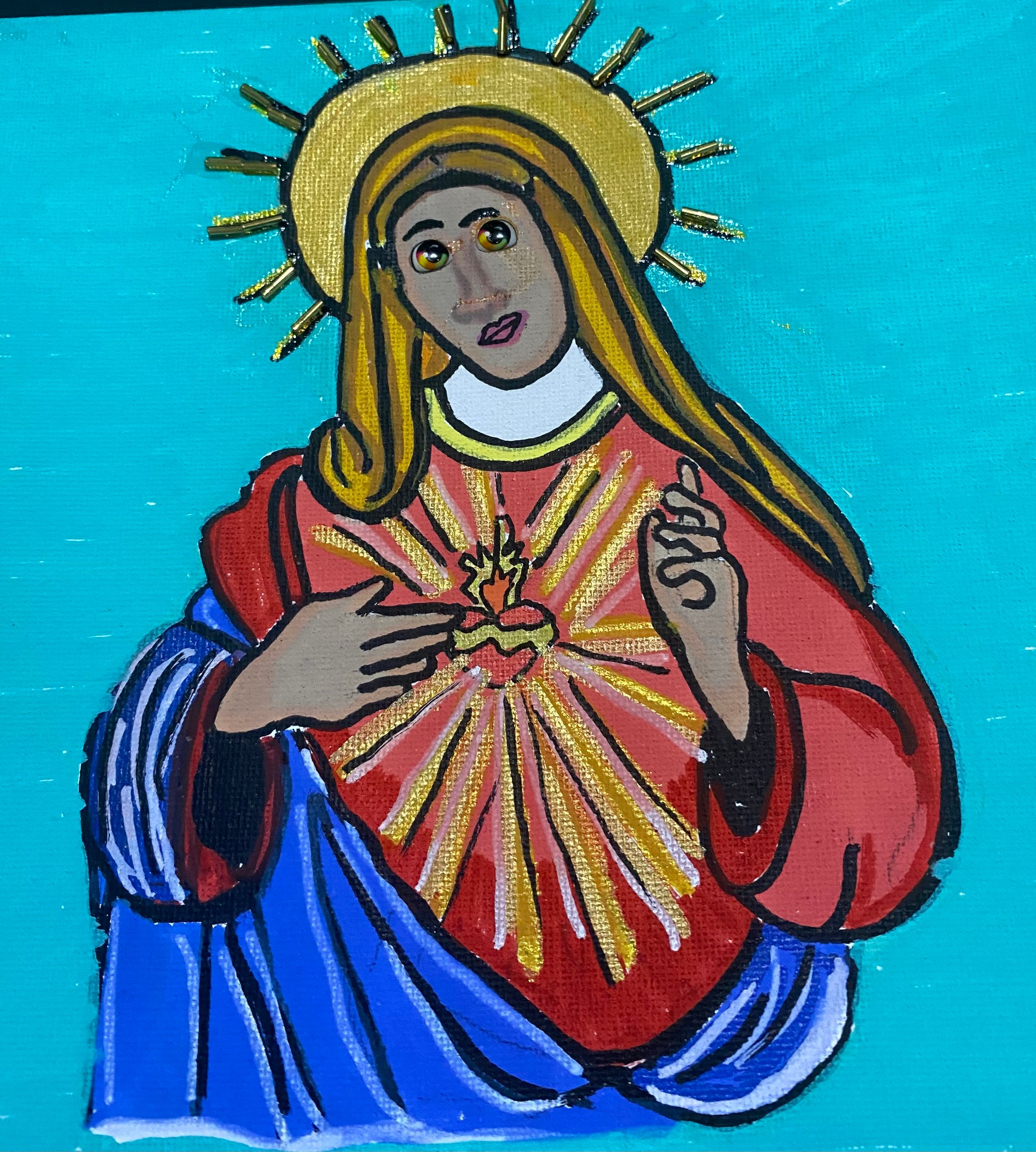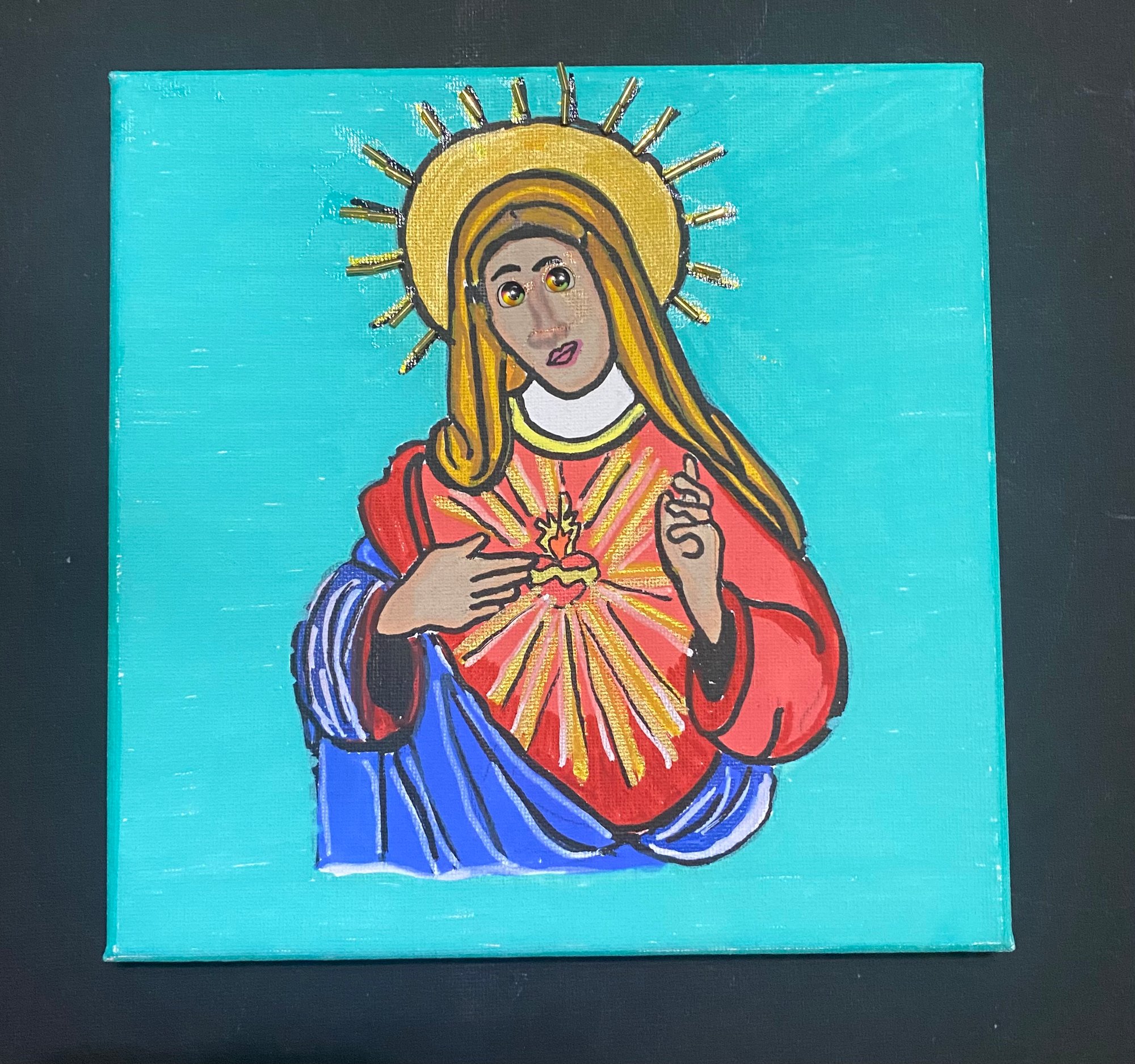 This 8 by 8 inch square canvas is painted using acrylic paints. Virgin Mary is in blues, reds and gold with the sacred heart on the center of her chest. There is a halo around her head with strikes of light made from gold bugle beads.