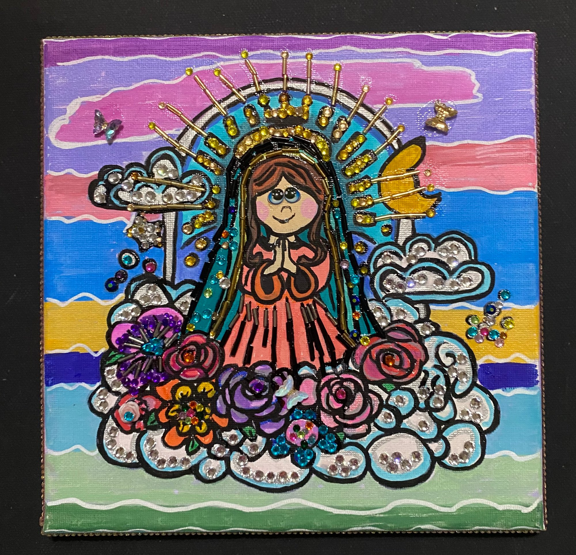 This 12-inch square canvas has been converted into a beautiful piece of Art. The canvas was painted with acrylic paints and accented with glass bugle beads, rhinestones and butterflies. There also is a resin flower tucked away.
