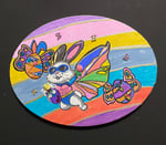 This 9 by 12-inch oval highlights what I think of as a fun Spring season. The background are different colors of acrylic paints in a lose rainbow effect. Magic and joy both spring from Wonderful Rabbit. She is wearing shades, a rainbow colored cape and has a great set of… abs. In one hand she’s holding a rose and the other hand is cradling a Princess of an egg.