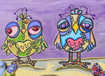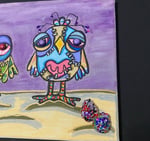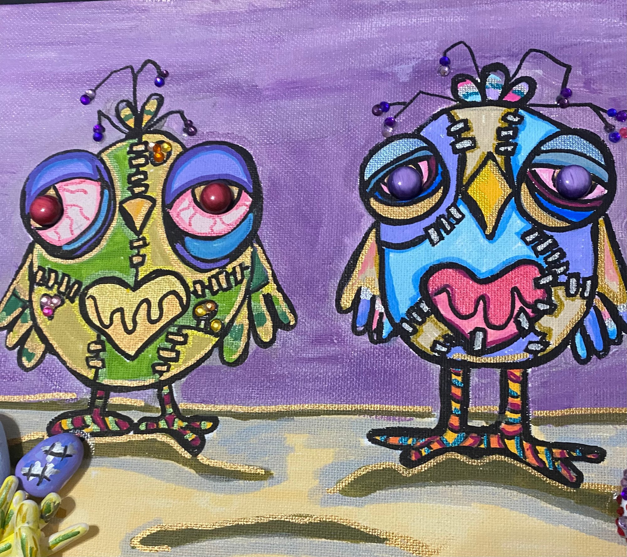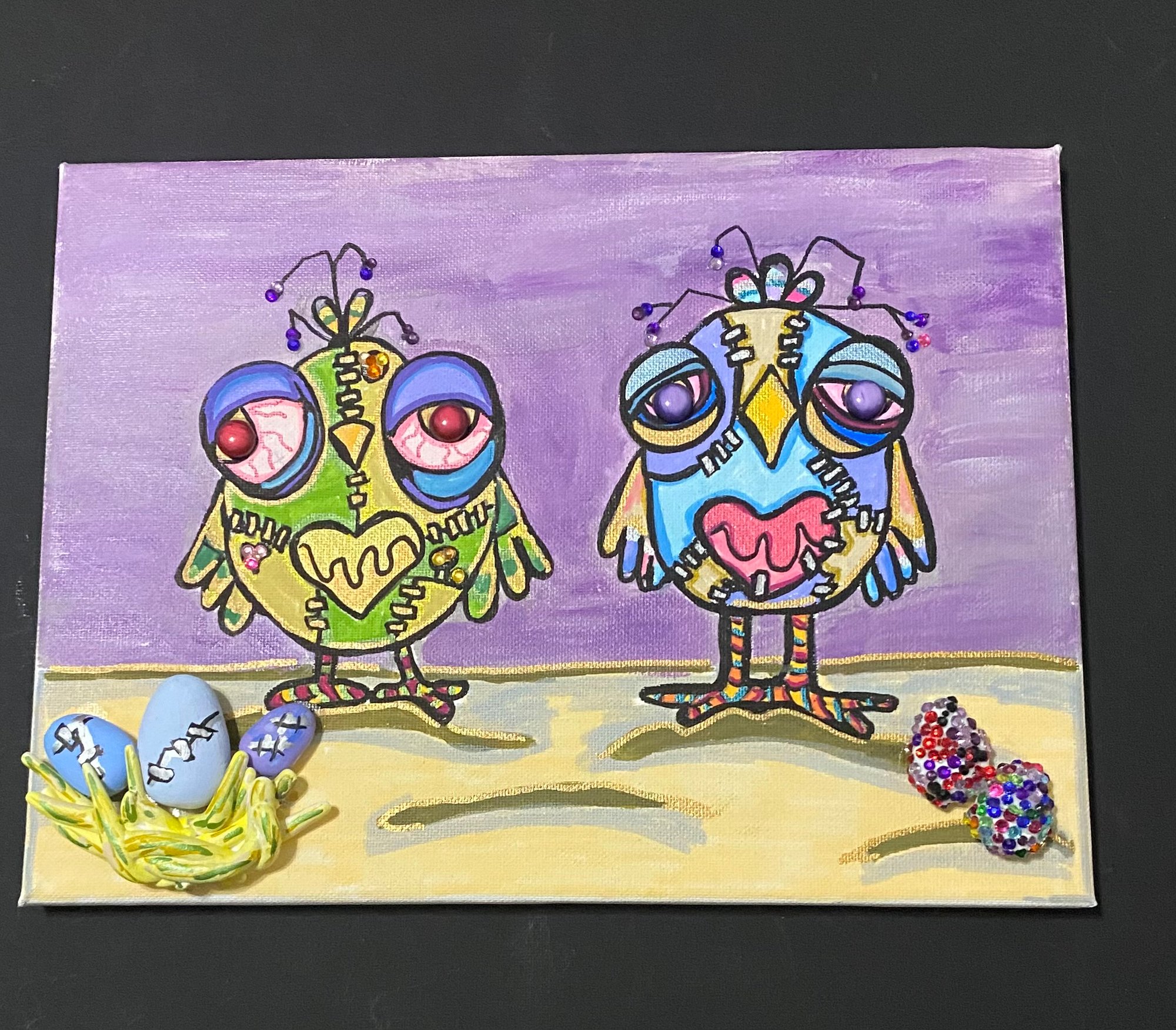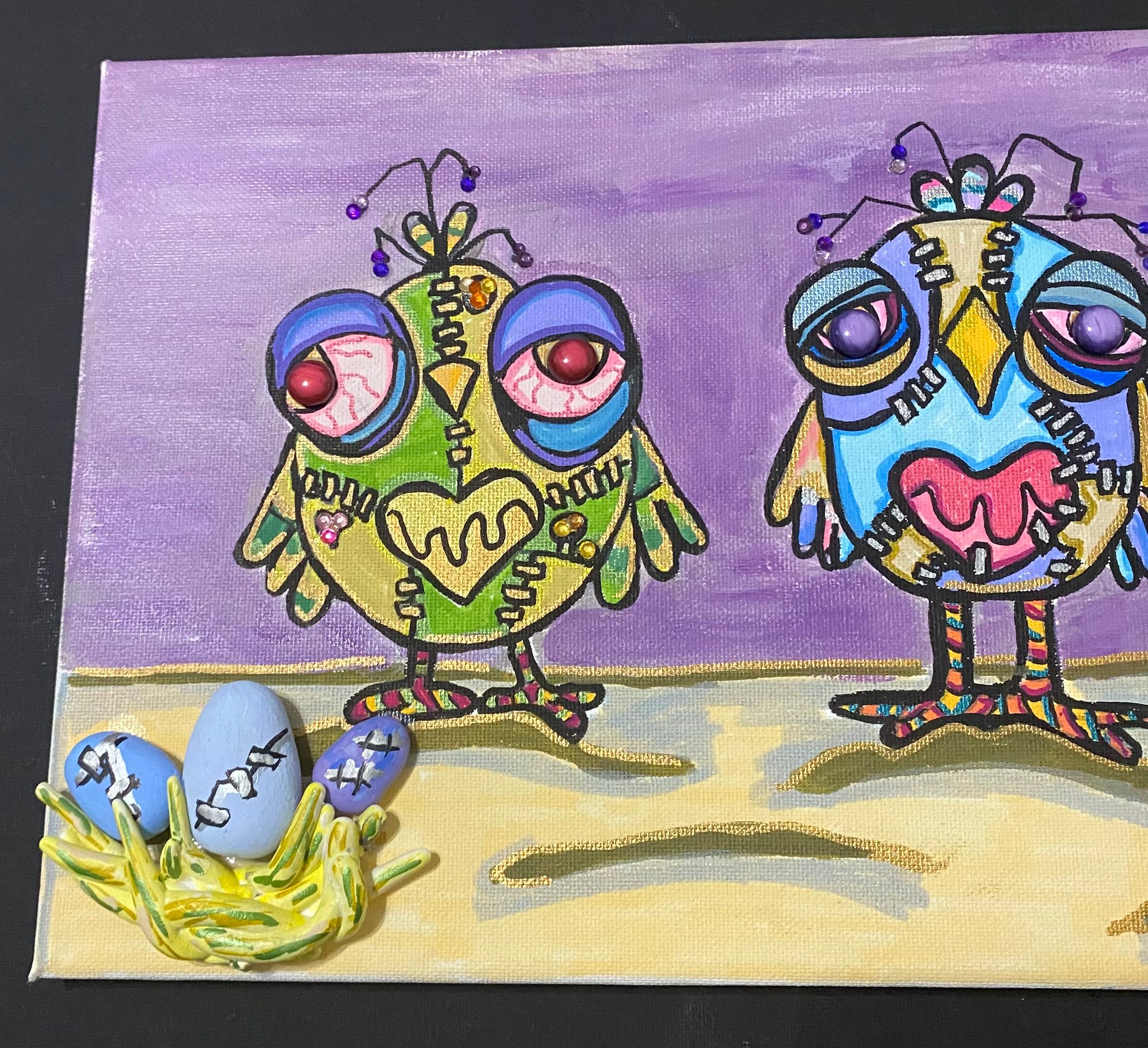 This 9 by 12-inch canvas was painted with acrylic paints. The design painted is 2 zombie baby chicks. There eyes are made from doll eyes. The nest and eggs, bottom right was created using foam clay. Once dried I painted each piece and securely placed it on the painting. On the bottom left side are two eggs, made some foam clay and then decorated with glass rhinestones.